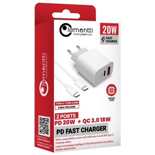 Incarcator Retea Fast Charge de la Lemontti, este compact si comod fiind destinat pentru incarcarea rapida si sigura a dispozitivelor dumneavoastra acasa sau la birou, datorita celor 2 porturi de incarare (USB-A si USB-C) poate incarca simultan 2 dispozitive oferind o putere de pana la 18W.