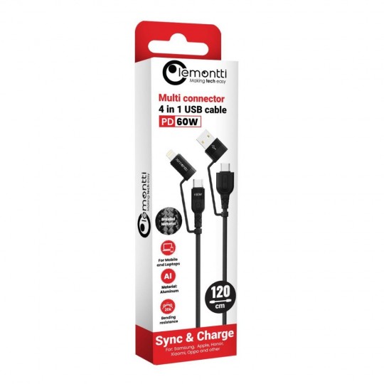 Cablul Fisheye Series 4 in 1, USB-A & Type-C la Type-C & Lightning de la Lemontti, acest cablu iti ofera tot ce ai nevoie pentru a-ti alimenta dispozitivele in cel mai rapid mod, iti incarci si transferi date rapid si eficient fara a avea mai multe cabluri separate.