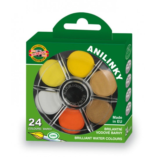 Acuarele cu diametrul tabletei de 22,5 mm, cu 24 de nuante de culoare stralucitoare, potrivite pentru tehnici grafice speciale, de ex. colorarea fotografiilor, pictura portretelor, pictura pe decoratiuni, decorarea oualor de Paste si multe altele
