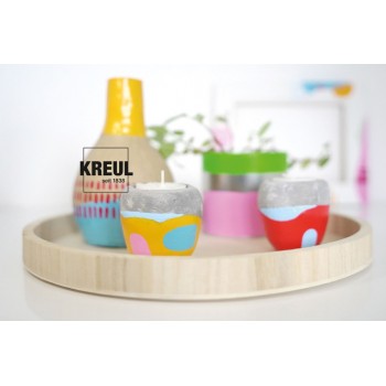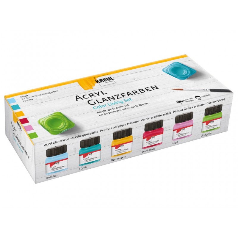 Setul de vopsele acrilice glossy KREUL Color Living aduce bucurie în interioarele caselor. Conține șase nuanțe ce sunt perfect coordonate coloristic între ele. Fie pentru suporturi de lumânări votive sau pentru mobilier, amestecul contemporan de nuanțe de culori reci și calde poate face soarele să strălucească chiar și în zilele plictisitoare și mohorâte. Decorul casei poate fi reînnoit cu ușurință pentru a-i da un nou aspect radiant. Vopselele acrilice nu sunt doar foarte opace, ci, după uscare captă un finisaj splendid, lucios. Rezistente la apă, la intemperii și la salivă. Un must-have pentru proiecte de bricolaj îndrăznețe și expresive!