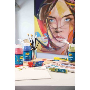 Este ușor de aplicat si se usucă rapid. Consistența lichidă și calitatea mată, profundă, a efectului vopselei după uscare sunt apreciate de artiști. Vopseaua acrilică Solo Goya Triton KREUL cuprinde un spectru de culori de 50 de nuanțe potrivite coloristic, precum și patru nuanțe fluorescente care strălucesc sub lumina neagră. Academiile de artă, scenografii și artiștii care pictează suprafețe mari confirmă randamentul ridicat și folosesc vopselele Solo Goya Triton atât pentru proiecte de interior, cât și pentru exterior.