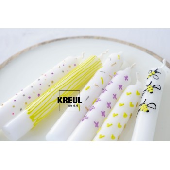 Decorarea lumânărilor cu Pen-ul pentru lumânări KREUL te face fericit pentru că nu este nimic complicat în utilizare. Doar începe să îți transpui ideile creative și modelele șic prin aplicare direct cu vârful aplicatorului, prin tamponare sau cu pensula. Am rafinat rețeta culorilor pentru Lumânări KREUL și am introdus ceară naturală de albine. Desigur, aceste culori pentru lumânări sunt produse în mod corect și în siguranță în Germania. Pentru o calitate pe care toți creativii se pot baza.