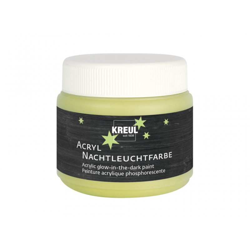 Semne, litere și desene care devin vizibile doar în întuneric. Discretă în timpul zilei, vopseaua acrilică Kreul care strălucește în întuneric se încarcă la lumina zilei și la lumina lămpii și apoi strălucește în întuneric. Ce are atât de special? Vopseaua uscată este rezistentă, produce margini clare și forme precise. Vopseaua acrilică Glow-in-the-dark Kreul este potrivită pentru a aplica modele pre-perforate, șabloane, pe pereți, recipiente și obiecte decorative. Consistența pastozei este ideală pentru designul motivelor pe care doriți să le reprezentați, indiferent de dimensiunea acestora – nu picură, nu curge sub șabloane, se simte plăcut și moale la atingere și strălucește într-o nuanță gălbuie reconfortantă.