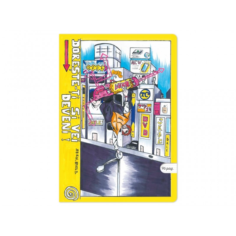 Într-un decor urban plin de culoare și energie, un tânăr își exprimă curajul și pasiunea, amintindu‑ne că visurile prind contur atunci când îndrăznim să le urmăm. Mesajul „Dorește‑ți și vei deveni!” completează perfect atmosfera optimistă, inspirând fiecare elev să creadă în propriul drum. Un caiet care nu doar adună idei, ci le și încurajează să crească.
