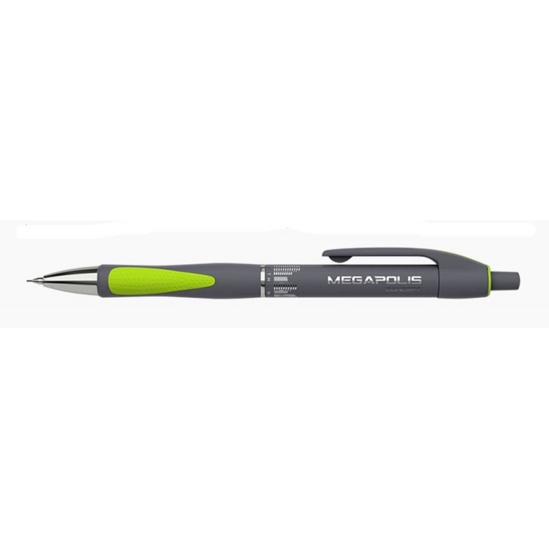 Creionul are un corp rotund lucios cu o zonă de prindere ergonomică, prevăzut cu două inserții de cauciuc.