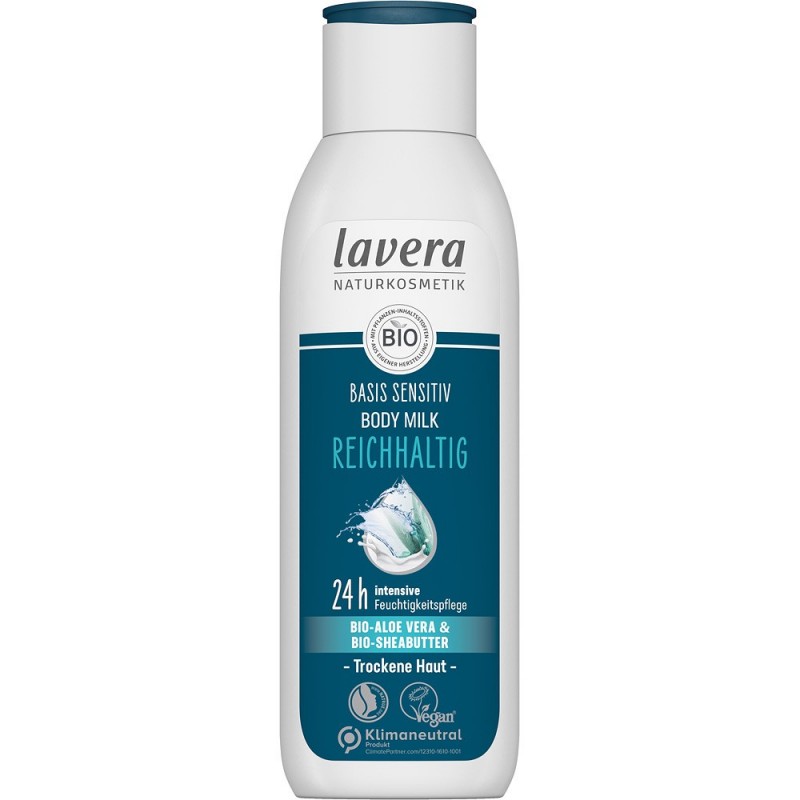 Lapte de corp sensitiv Lavera, bogat în aloe vera bio și unt de shea bio, oferă 24 de ore de îngrijire intensivă hidratantă pentru pielea uscată.
