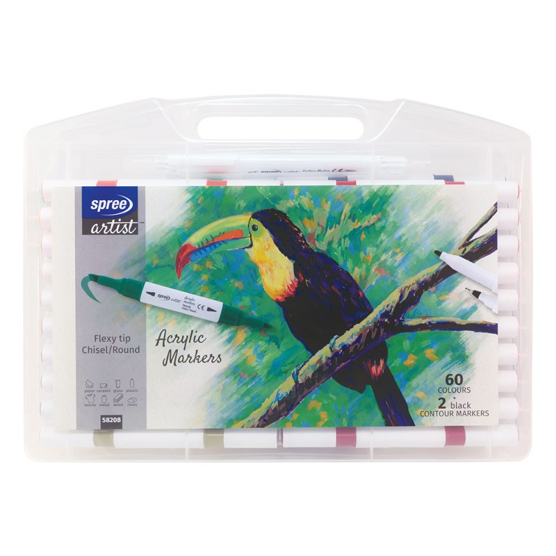 Set 60 Markere FLEXI ACRILIC SPREE – Paleta Completa pentru Creativitate Transforma orice obiect intr-o opera de arta cu cea mai cuprinzatoare colectie de markere acrilice! Cu 60 de nuante vibrante si o aderenta exceptionala pe aproape orice material, acest set profesional iti ofera libertate totala pentru a decora, picta si personaliza orice suprafata. De ce sa le alegi: