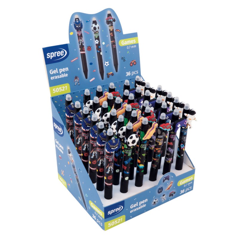 Acest produs este un set de pixuri gel cu stergere marca Spree, model "Games", prevazute cu figurine 3D.