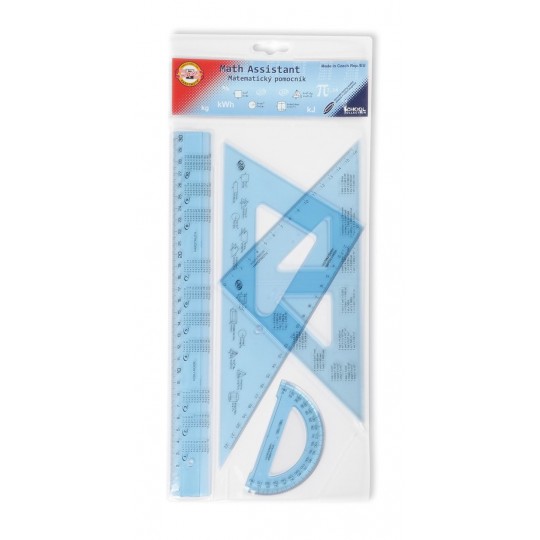 Cuprinde rigla 30 cm; echer 45º-16cm, echer 60º-22cm; raportor 180º-10cm. Este fabricat din polistiren albastru transparent. Imprimarea scalelor este rezistenta in conditiile unei utilizari normale.